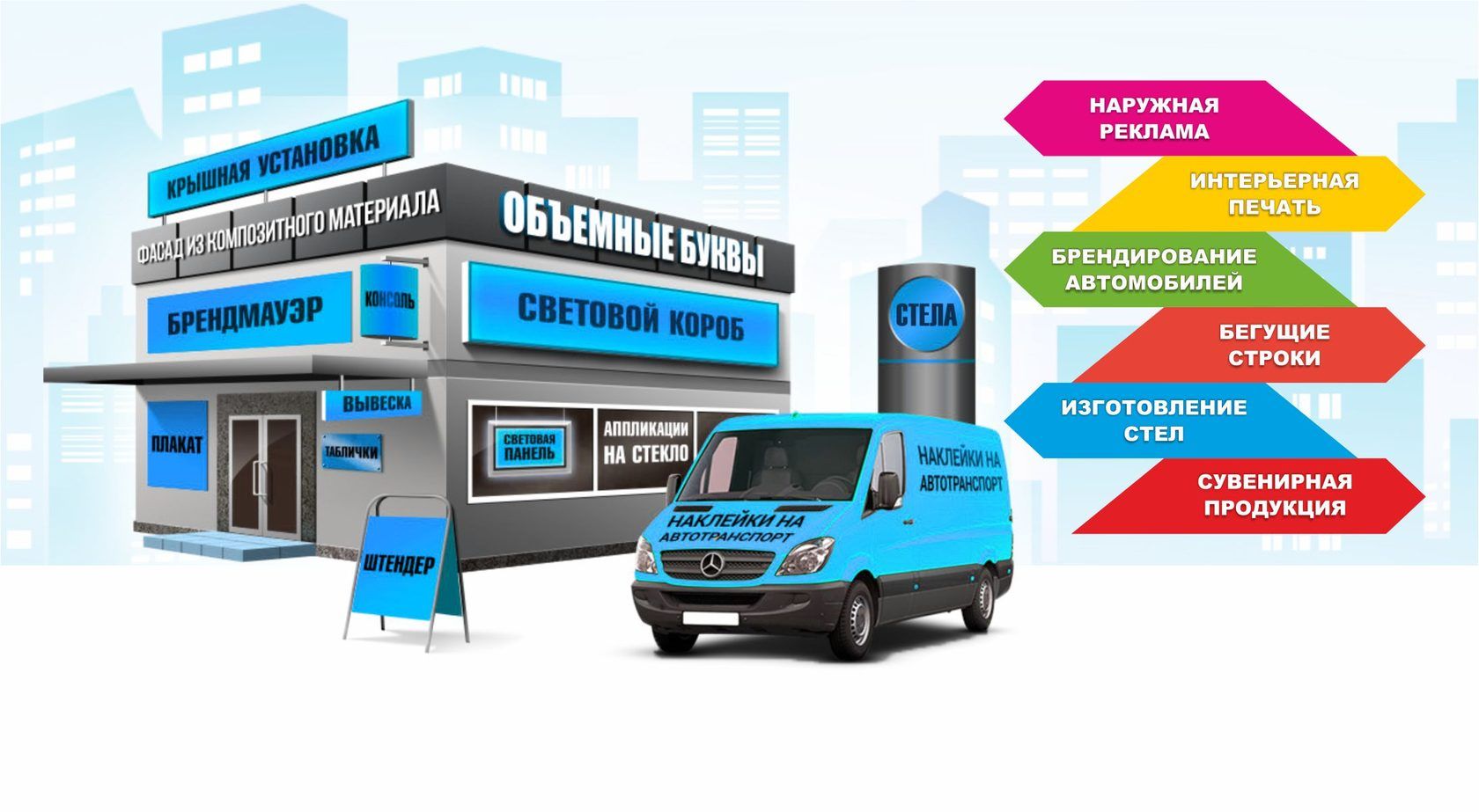 Изготовление фасадных и интерьерных вывесок, печатное производство, изготовление металлоконструкций для вывесок и крышных установок, фрезеровка и лазерная резка, монтаж и демонтаж вывесок, брендирование автомобилей.